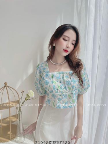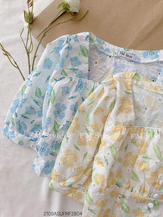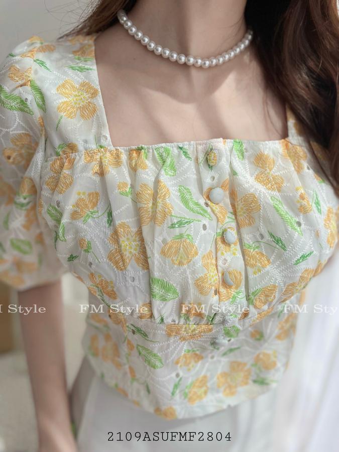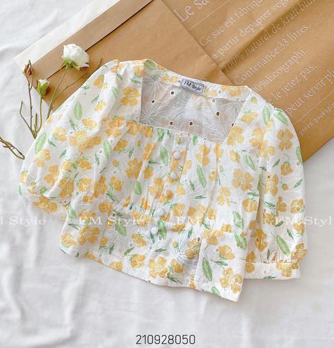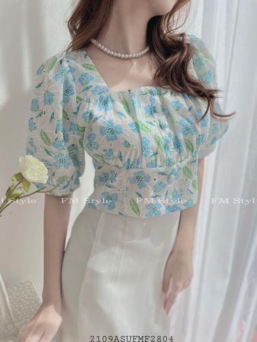 Áo hoa thêu cổ vuông nút bọc
