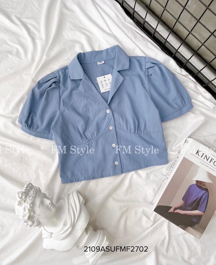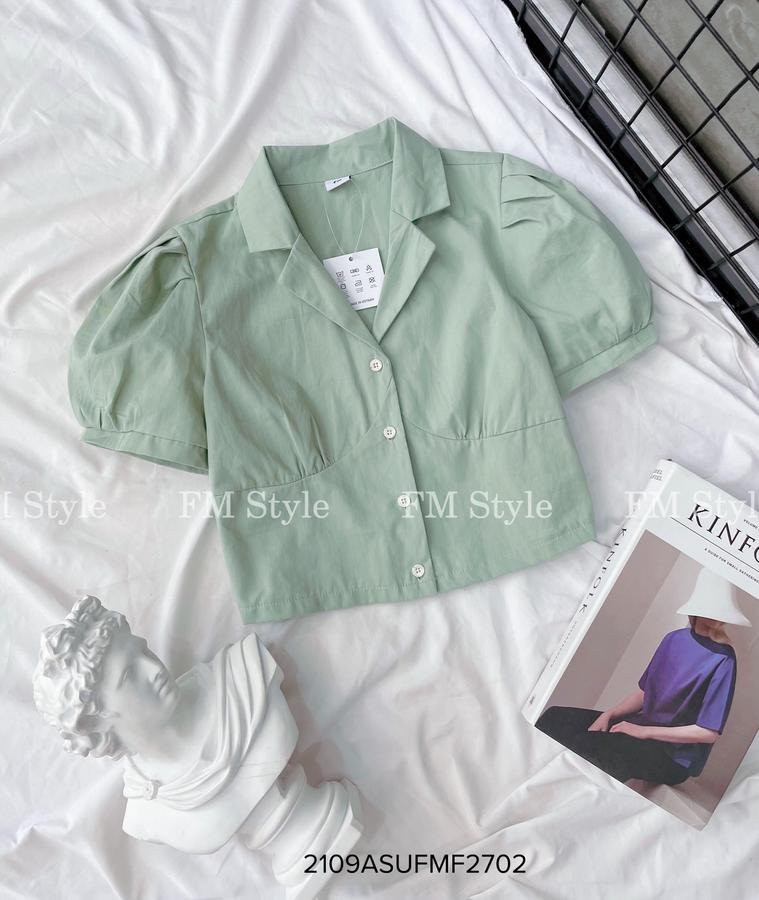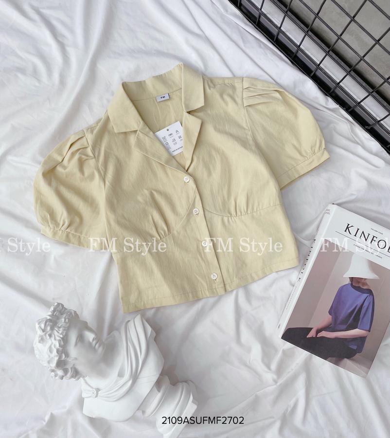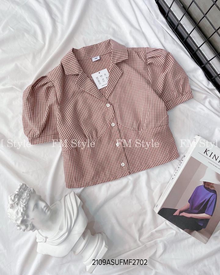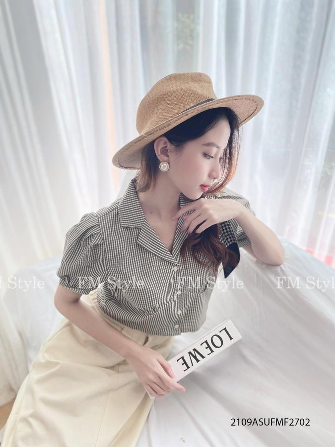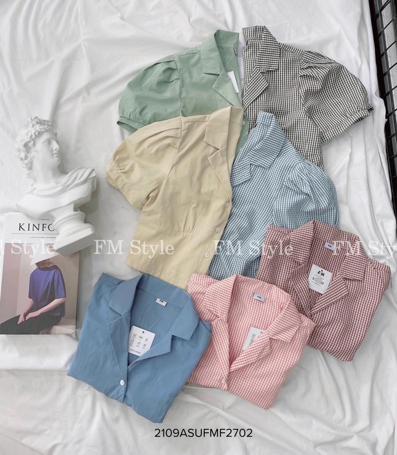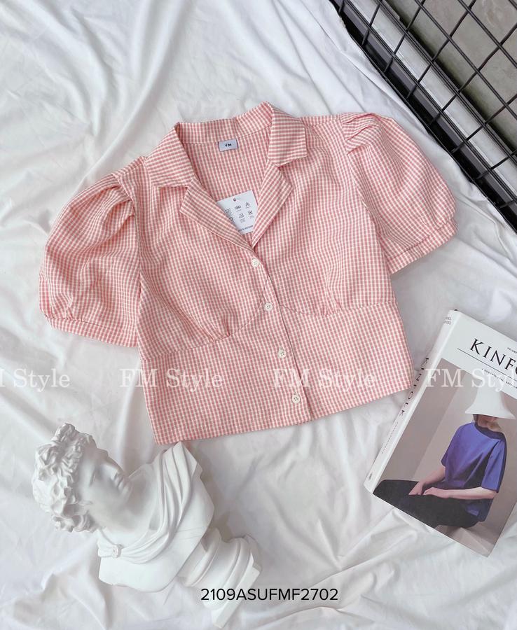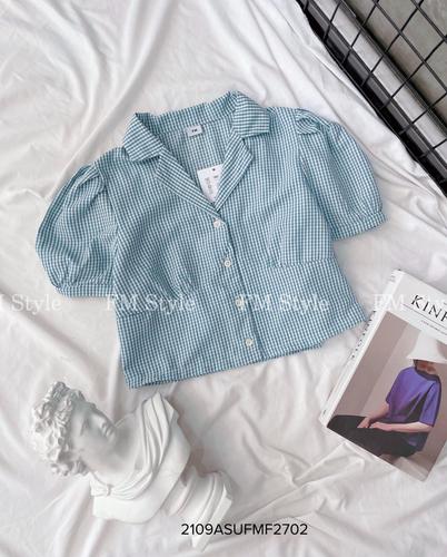 Áo kẻ crop cổ vest tay ngắn
