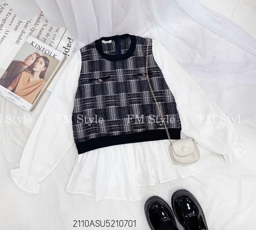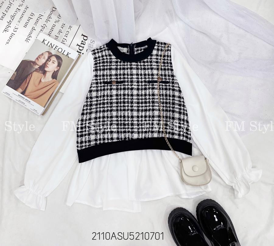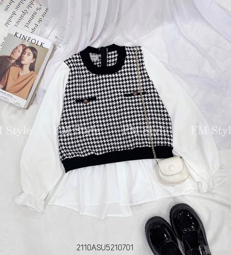 Áo kiểu tay dài phối dạ cổ tròn xinh