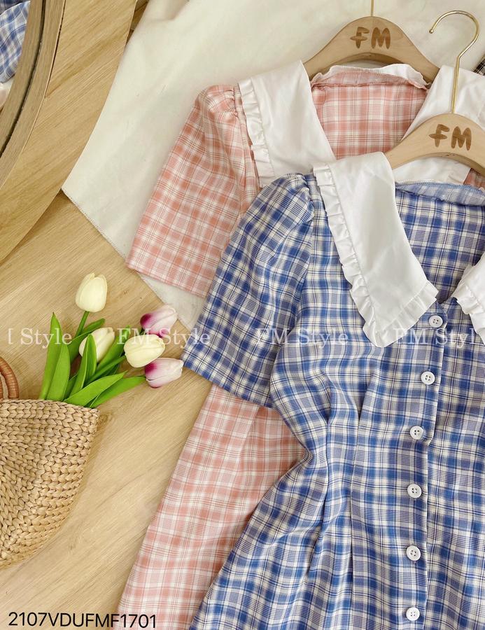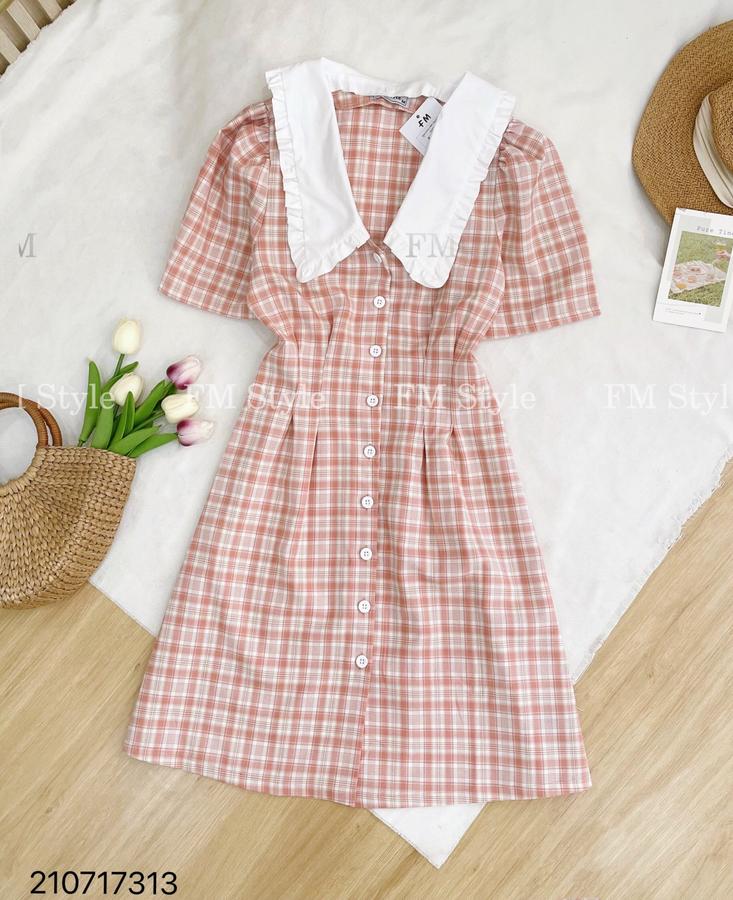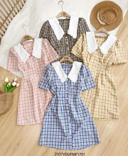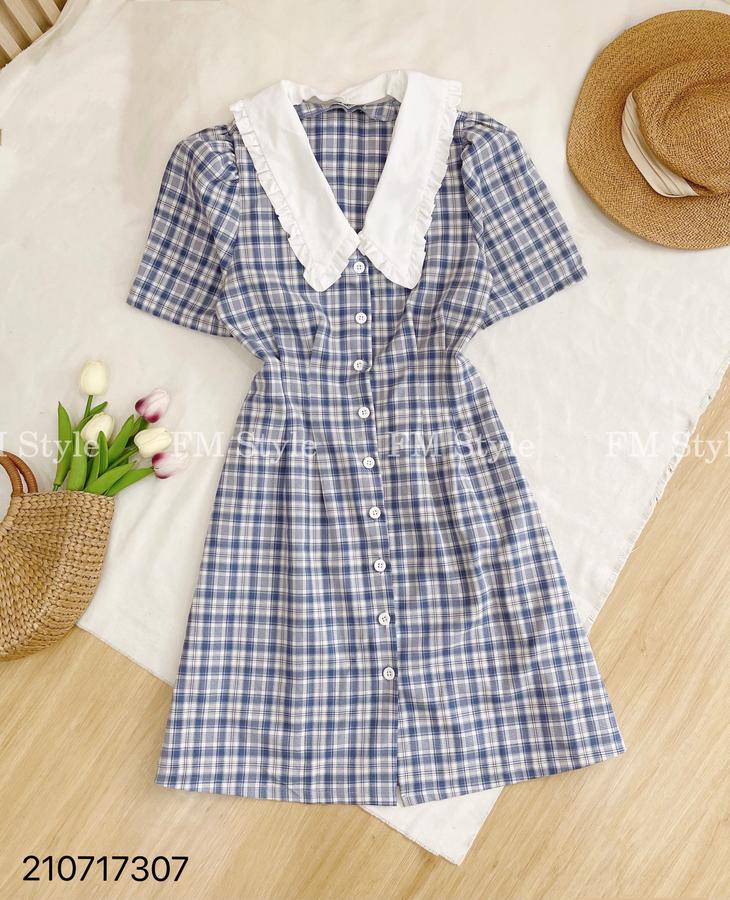 Đầm kẻ cổ sen chít eo