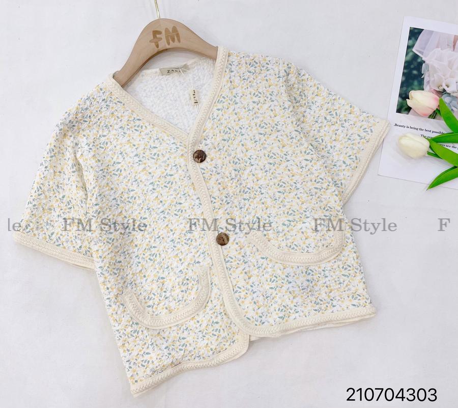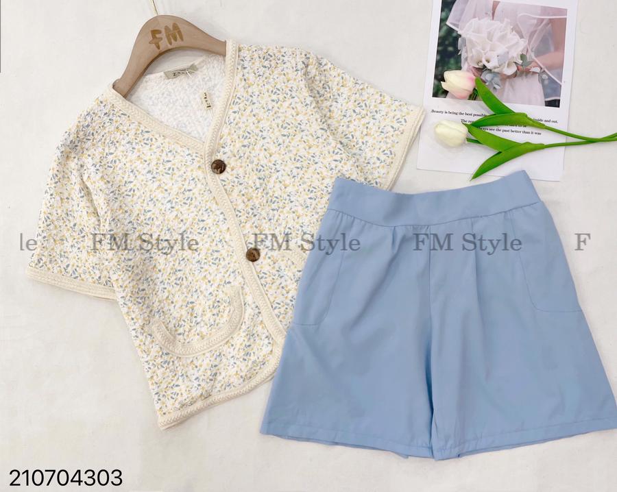 Set short áo hoa cổ V viền hai túi