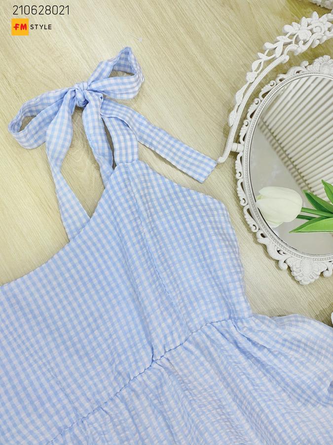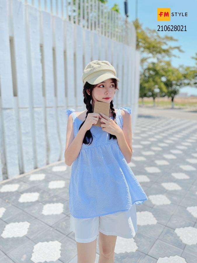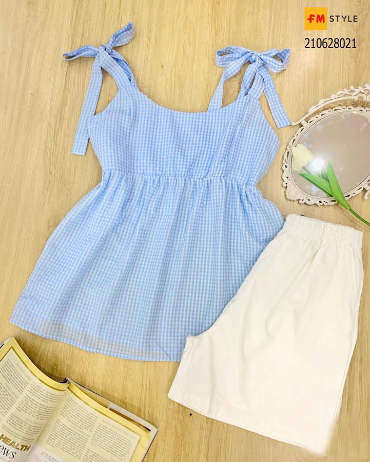 Set short trắng áo kẻ xanh